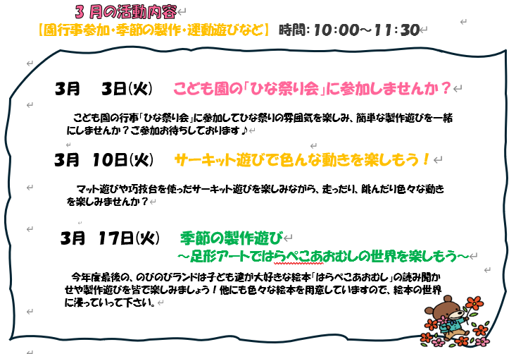 2026.02.25 お知らせ kitakodoen 3月のびのびランド 3月の のびのびランド活動予定です! 寒い冬も終わりを告げ、温かい春がやってきました。今月も楽しい活動を予定していますので、沢山の参加をお待ちしております。 コメントを残す コメントをキャンセルメールアドレスが公開されることはありません。 ※ が付いている欄は必須項目ですコメント ※ 名前 ※ メール ※ サイト 次回のコメントで使用するためブラウザーに自分の名前、メールアドレス、サイトを保存する。