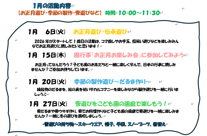 2025.12.25 お知らせ kitakodoen 1月のびのびランド 12月の、のびのびランドではスライム作りや感触遊び クリスマスにちなんだ製作遊びや楽器遊びで 盛り上がりました! 来月はお正月にちなんだ活動や冬の遊びを取り入れ楽しみたいと思いますので、ご参加下お待ちしております。 Leave a Reply Cancel replyYour email address will not be published. Required fields are marked *Comment * Name * Email * Website Save my name, email, and website in this browser for the next time I comment.