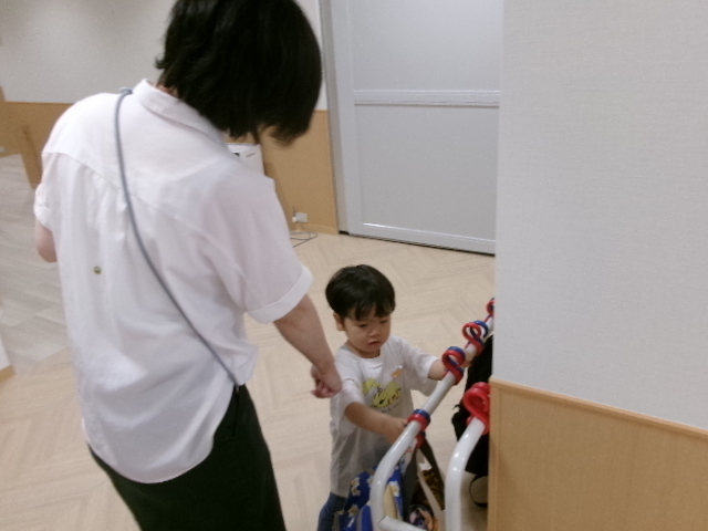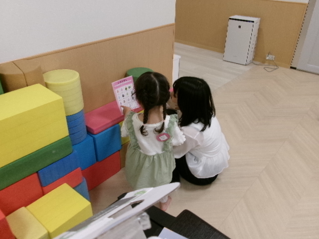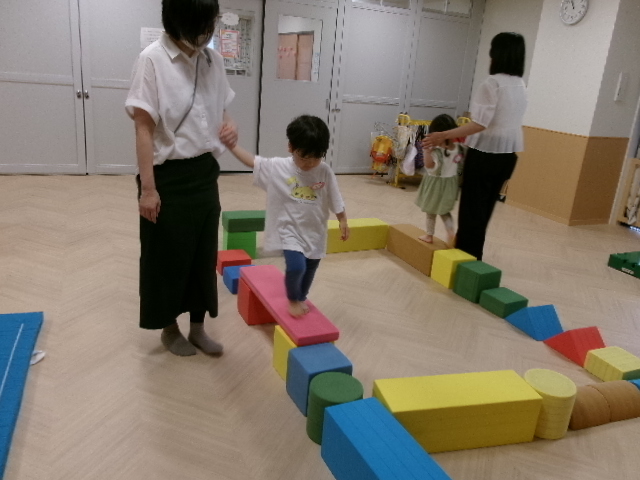 その後はいろいろかけっこをして、ソフトブロックを組んでサーキット遊びへ。斜めにしたり、橋にしたり、凸凹道や回り道。たくさん動かして遊びました。