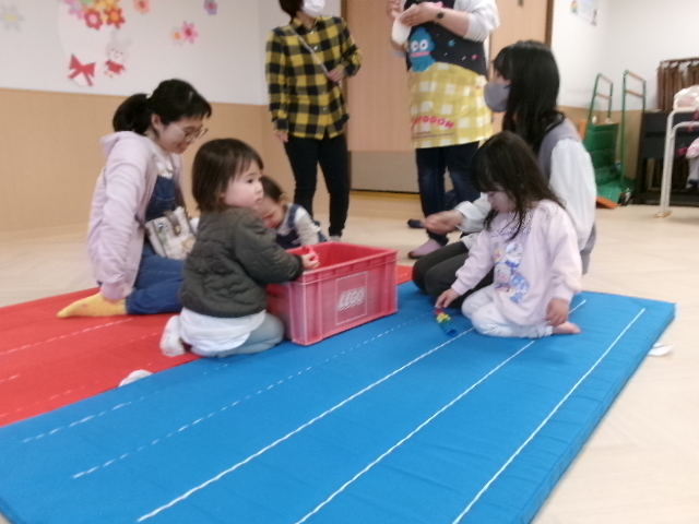 お友達が集まるまでの様子です。「見たことないブロックだね」とお家の方や保育者と話しながら繋げるブロックで遊びました。