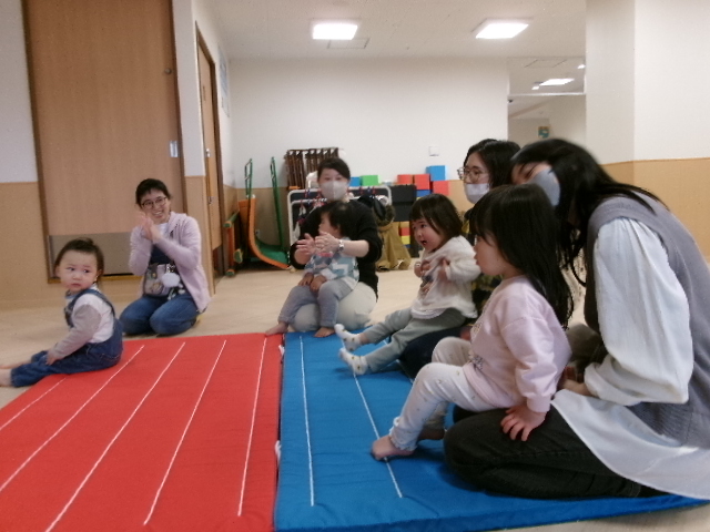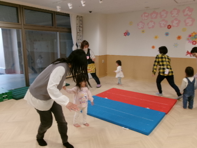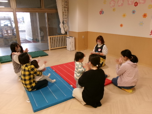みんなが揃ったところで朝の会をしました。春のお歌を歌ったり、手遊びや体操・ふれあい遊びをして楽しみました。